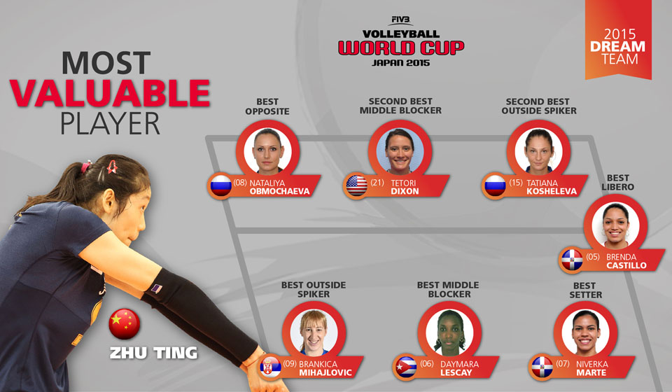 The other players featuring in the 2015 Women's World Cup Dream Team are 1st Best Outside Spiker Brankica Mihajlovic - second-placed Serbia's best scorer in the competition - Russians Tatiana Kosheleva (2nd Best Outside Spiker) and Nataliya Obmochaeva (Best Opposite Spiker), who was Russia's best scorer in the competition, Daymara Lesday of Cuba (1st Best Middle Blocker), Tetori Dixon of USA (2nd Best Middle Blocker) and Dominican Republic players Niverka Marte (Best Setter) and Brenda Castillo (Best Libero).